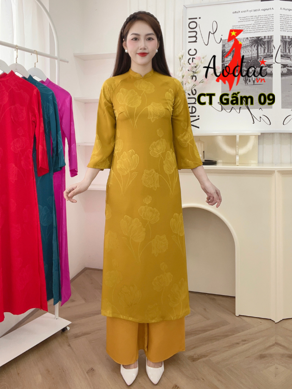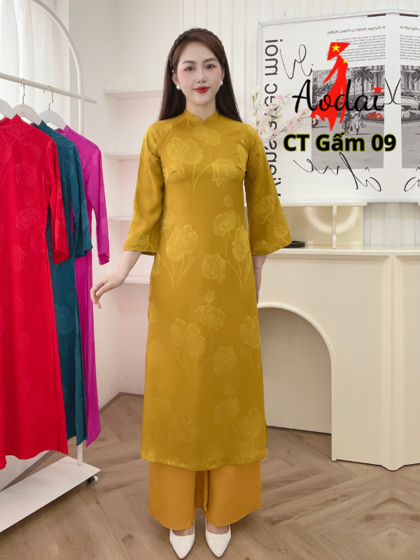 Áo dài cách tân Gấm G09 màu vàng đồng, cổ cao 2cm tay lỡ, Áo dài cách tân may sẵn chất lượng.